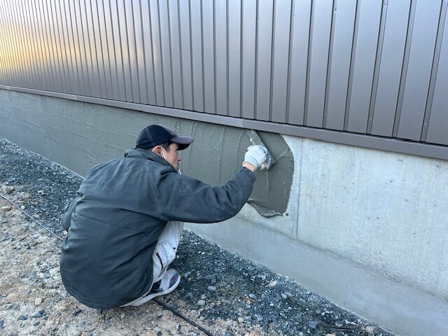 基礎巾木の下地作りを行います。躯体の状態が良くなかったため、ベース部分と立ち上がり部分のつなぎ目を先に補修します。