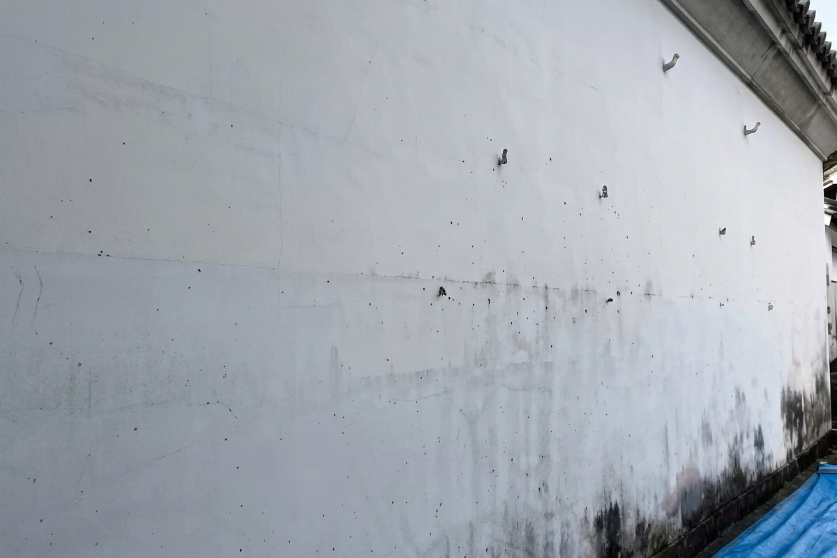 外壁には、長年の雨だれによる汚れやカビが見られ、さらに細かなひび割れや漆喰の浮きも確認されました。見た目の問題だけでなく、このまま放置すると建物の劣化につながる恐れがある状態です。