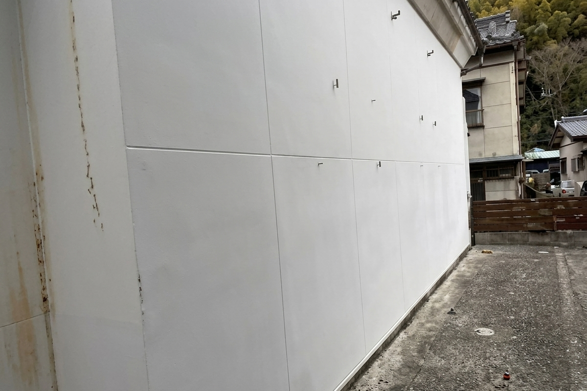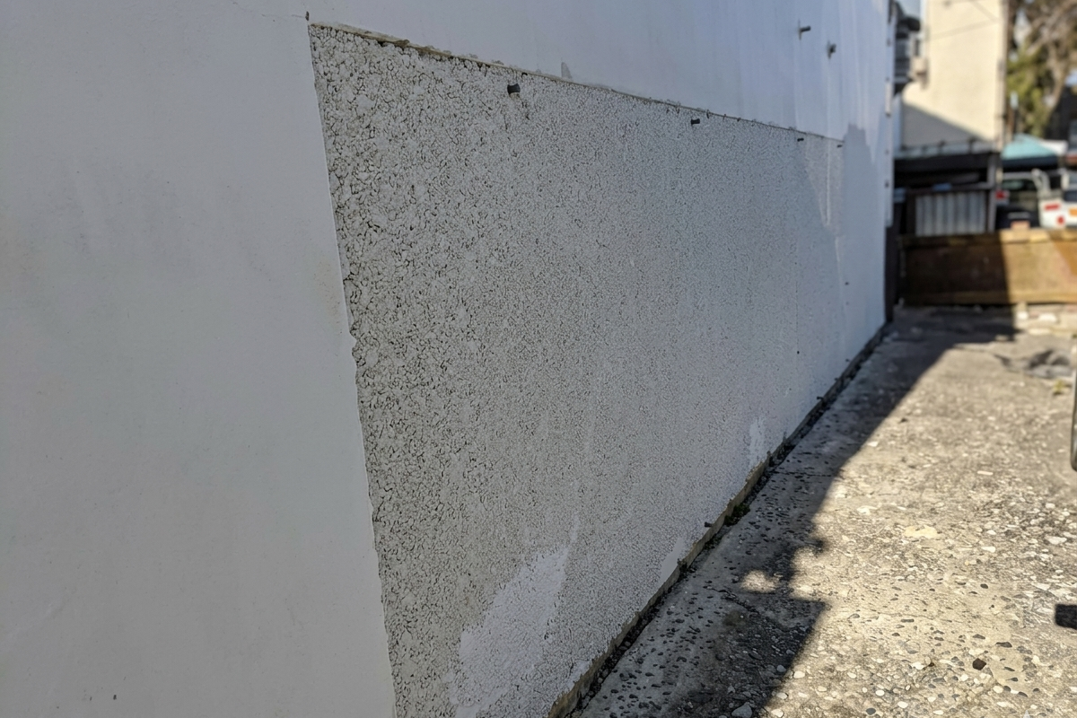 中塗り後の状態です。大きなくぼみは深いところで約5cmほど取れていたため、そのまま仕上げるのではなく、専用の材料でしっかりと埋めてから平らに整えています。