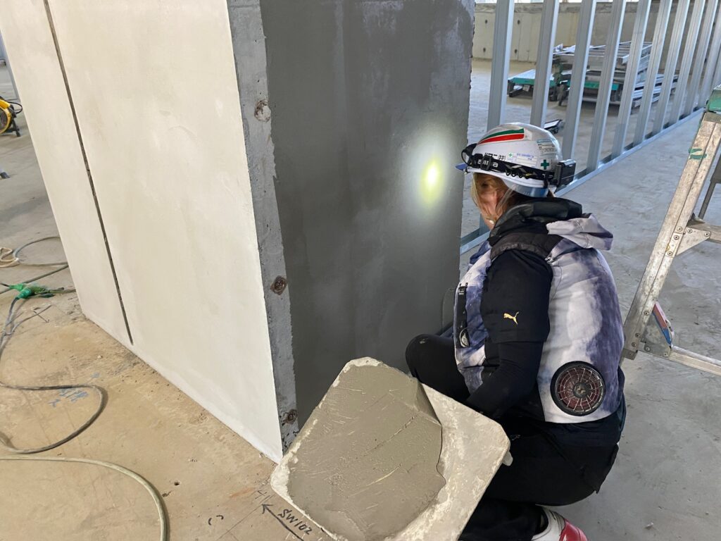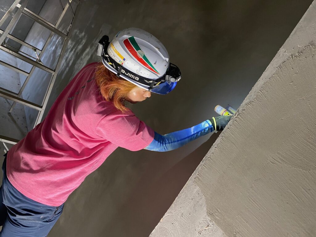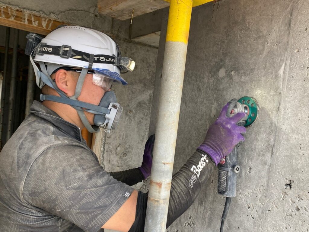 型枠が外れたら、モルタルを塗る前に下地処理を行います。Pコンと言われる穴をモルタルで埋め、表面にディスクグラインダーを掛けます。粉塵が出るので、保護メガネと防塵マスクを着用して行います。