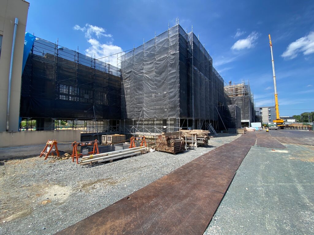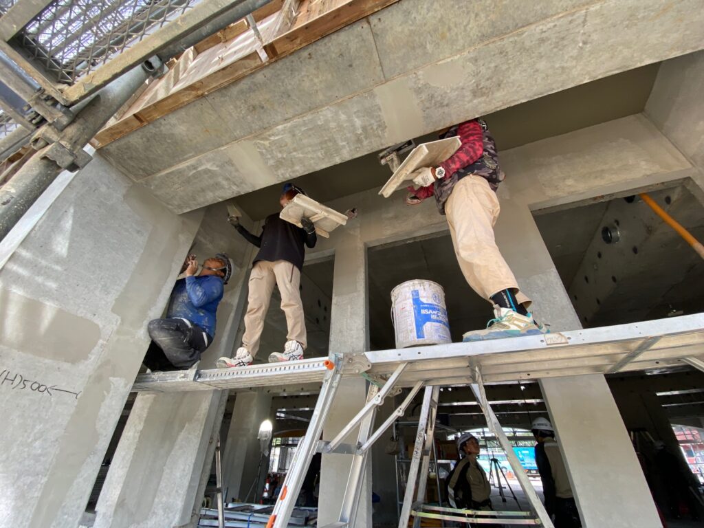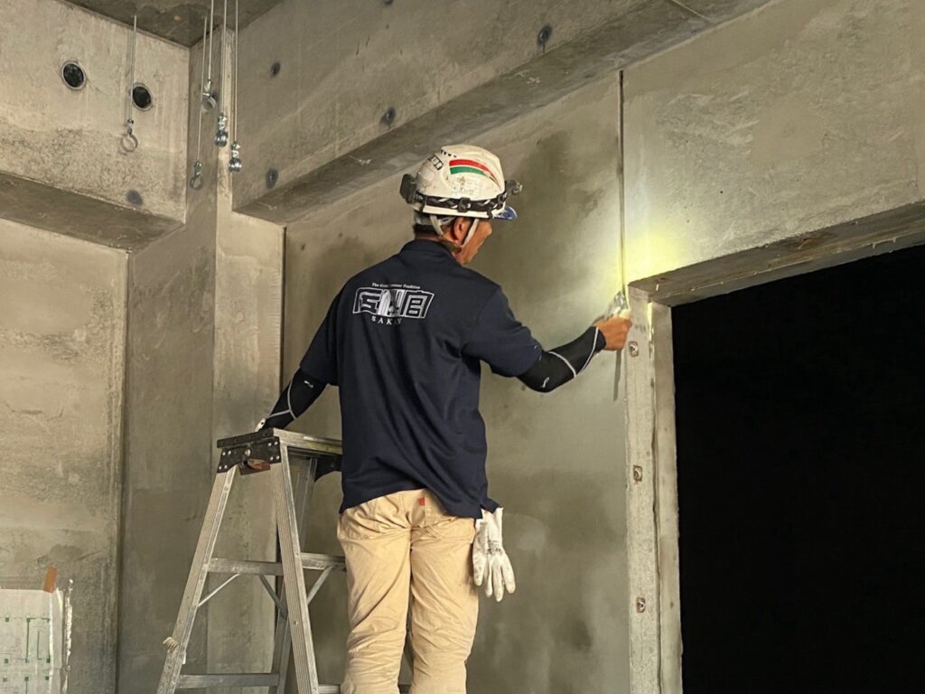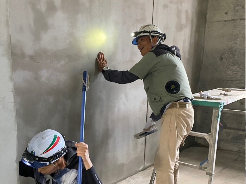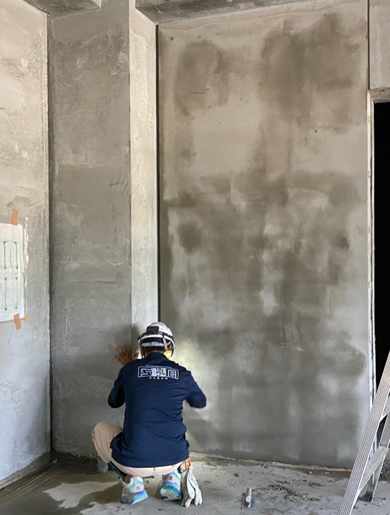 下地処理の後、張り合わせた型枠の段差が表面に出るので、目違い払いという部分補修を行います。その後、仕上げの精度に合わせた全面補修をします。
