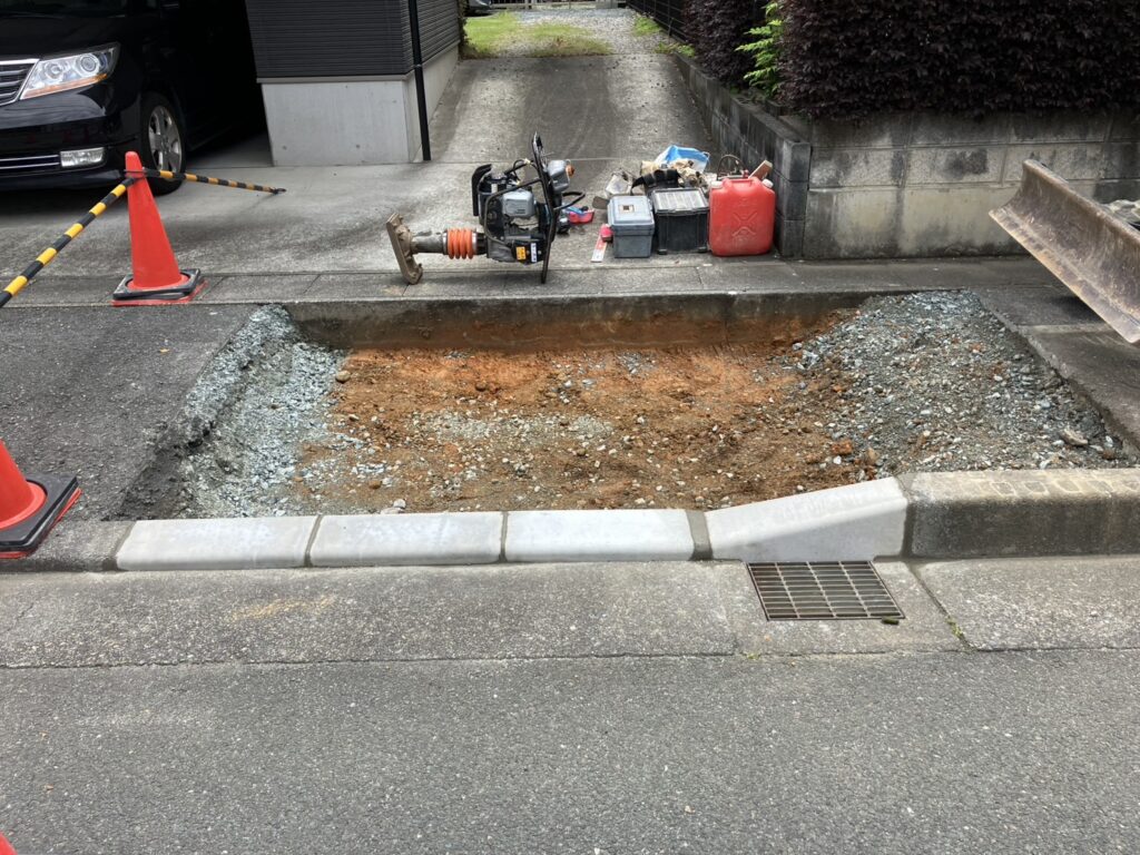 浜松市中央区地内にて乗入れ位置を変更する承認工事を施工しました。写真右側の進入路を使用しやすくしたいとの依頼でした。先ずは各種申請書類を提出し許可を受け工事を開始します。
