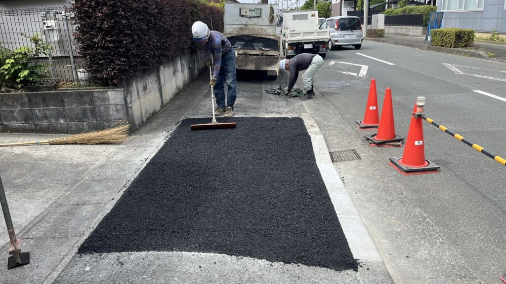 アスファルト合材を敷き均し、十分に転圧を行い、完成になります。