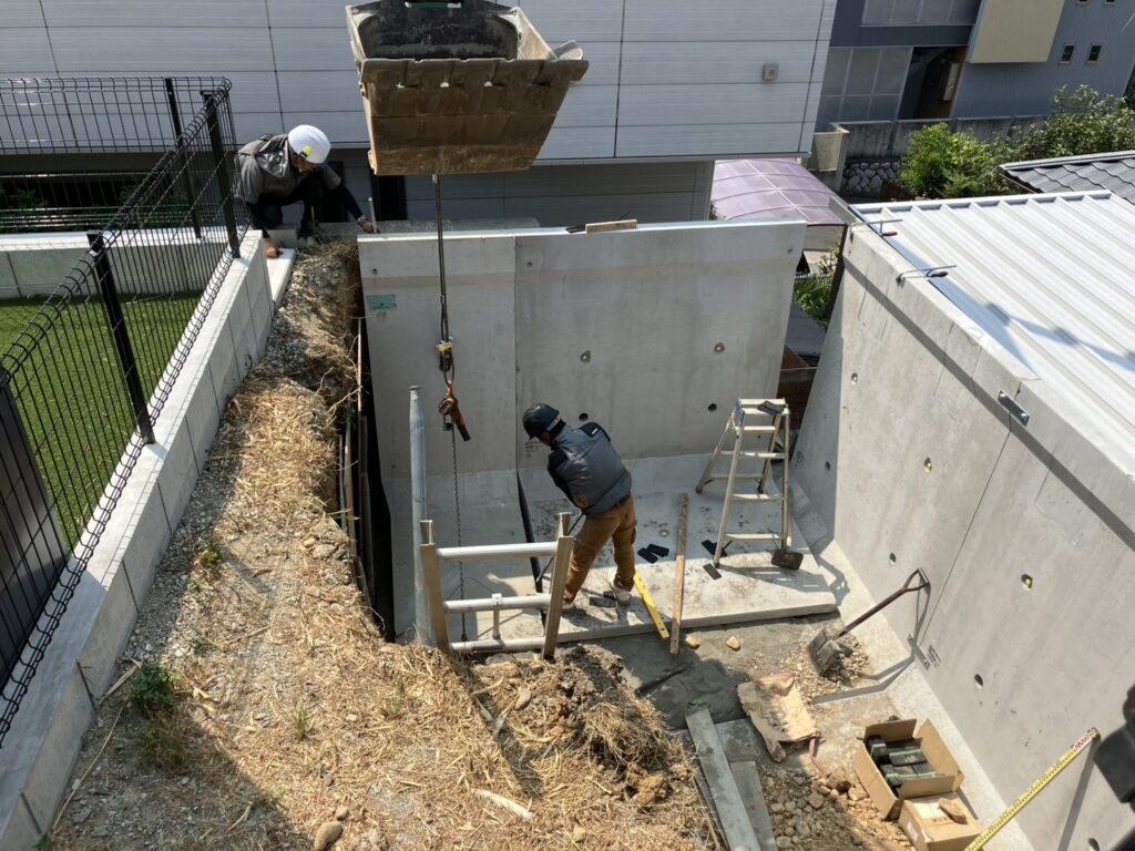 まず最初に、重機を使用して掘削作業を行い、その後、古くなった既存の土留め壁を取壊し作業によって撤去します。取壊し完了後、地盤を整えたうえでベースコンクリート(基礎コンクリート)を施工します。