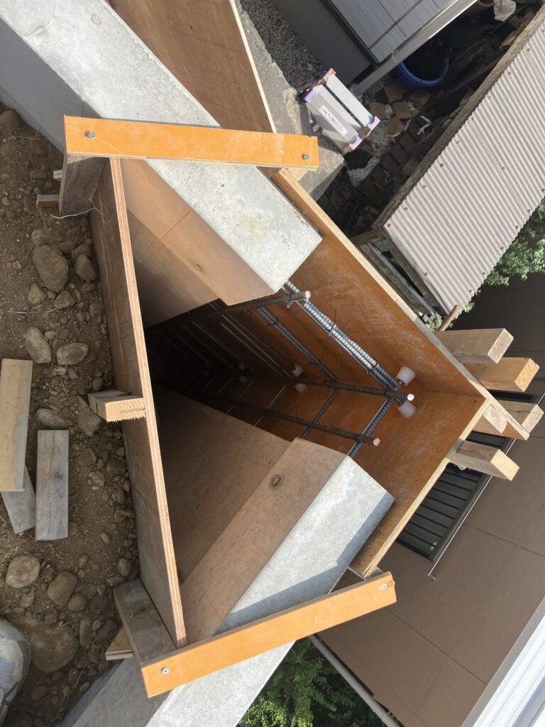 L型擁壁を並べて設置した後は、製品と製品の接続部分(取り合い部分)の施工を行います。この部分は現場の状況に合わせて調整する必要があるため、現地で鉄筋を組み立てて補強し、その周囲に型枠を設置します。その後、型枠の中にコンクリートを流し込む(打設する)ことで、隣り合う製品同士を一体化させ、構造物としての強度を高めます。この工程により、擁壁全体がしっかりと連結され、長期間にわたって安定した性能を発揮できるようになります。