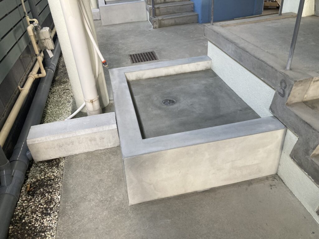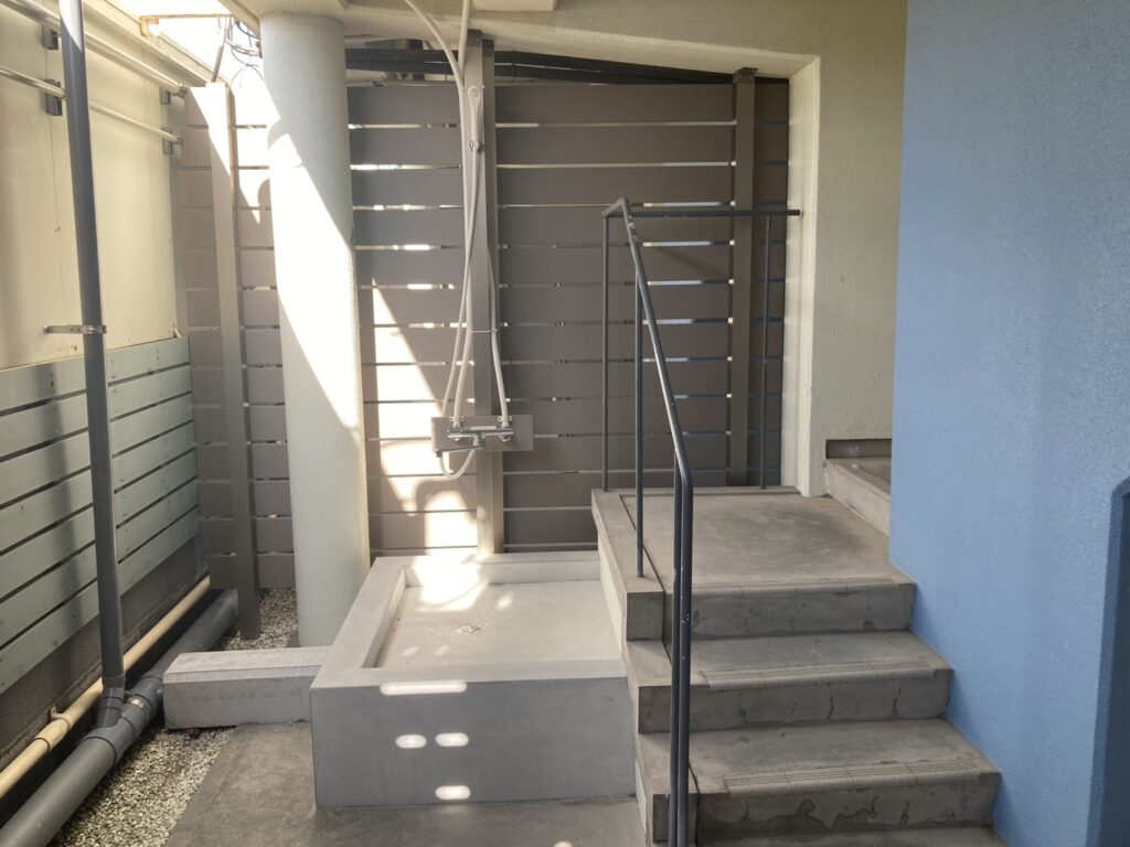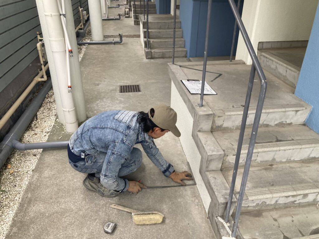 通路へシャワー台設置します。スミ出し。